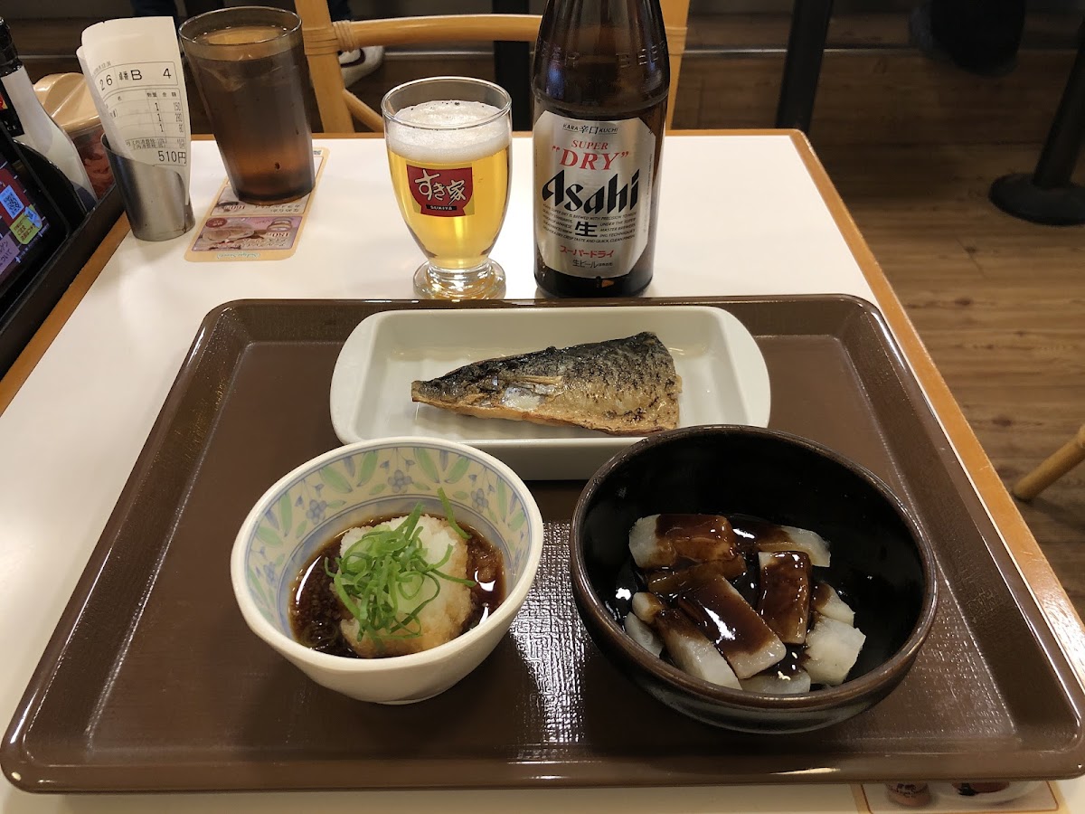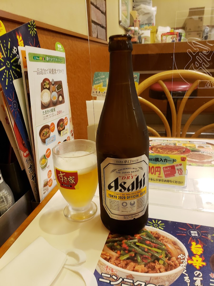 The restaurant's beverage menu also has a great selection, including chilled 瓶ビール (bottle beer) for those looking to unwind with a drink alongside their meal. It's the perfect pairing with any of Sukiya's hearty dishes.